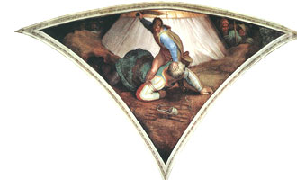 "Что же можно сказать о четырех историях по углам в распалубках этого свода? На одной из них Давид со всей юношеской силой, какая только может потребоваться, чтобы одолеть великана, отрубает ему голову, приводя в изумление солдат, чьи головы окружают поле битвы" Вазари.